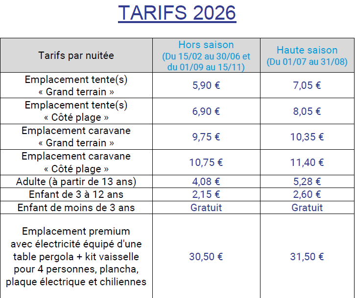 - Tarif dégressif appliqué à partir de la 31ème nuit pour les séjours en emplacement toile de tente.